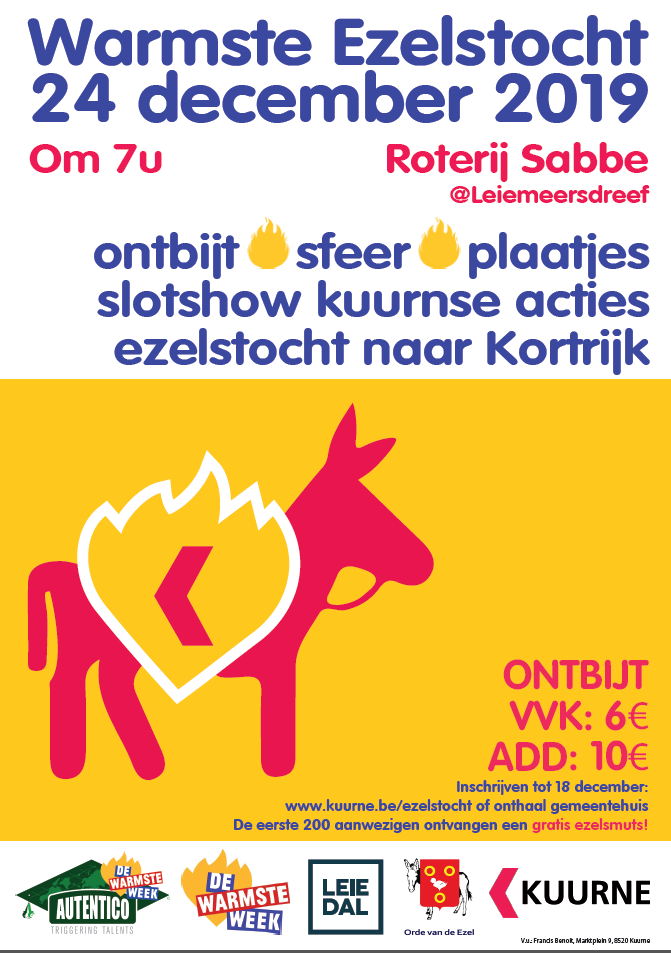 We starten met een warm ontbijt in de Roterij Sabbe (Leiemeersdreef). Ondertussen zorgen we voor plaatjes, sfeer en verwelkomen we alle initiatiefnemers van warme acties in Kuurne. Daarna gaan we samen met ezels, belgerinkel, licht en veel warmte richting het N.Mandelaplein in Kortrijk.