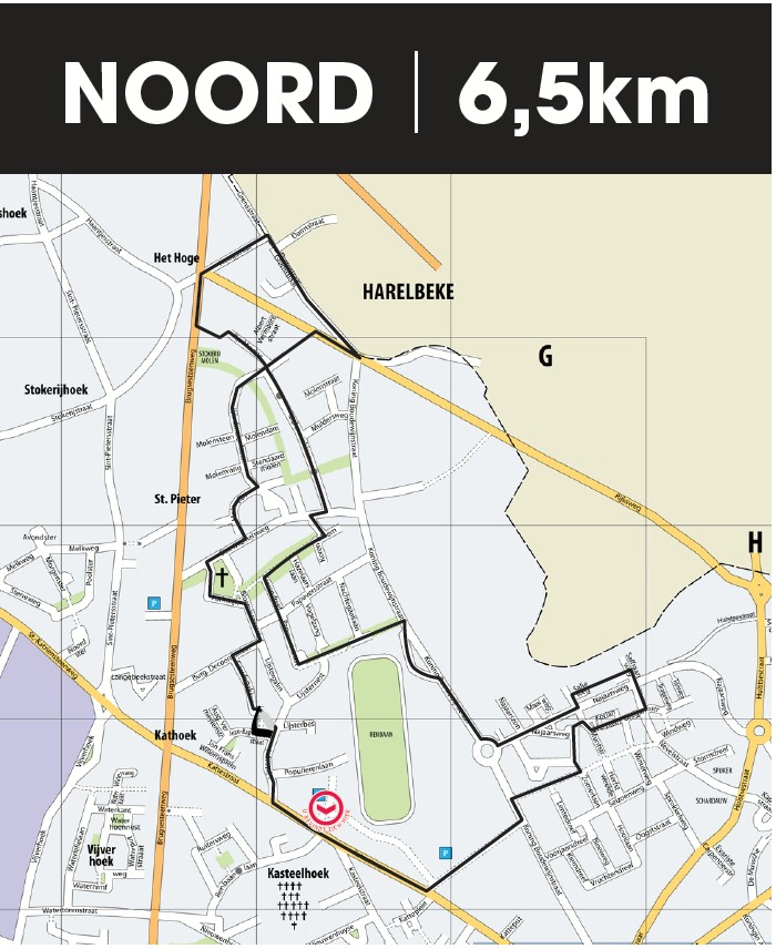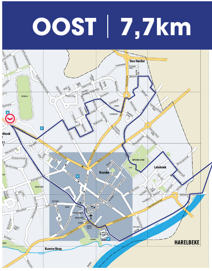Beschrijving: wandelen langs het sportpark en speelplein, hoeve vandewalle , door de hoevewijk waar je kan kiezen om het mooie wandelpad in het Heulebeekdomein te kiezen of de verharde paden voor rol- of kinderwagens te nemen via bloemenhof om samen te komen en via de Roterijstraat , de leiemeersten te bewandelen, aan de roterij Sabbe gaat het langs het autovrije jaagpad tot aan de jachthaven om via een ommetje van het vlaspark het Markplein te bezoeken, via een stukje kouterstraat gaan we langs de het wooncentra en de centrumschool , de vlindertuin en de bib door de kattebelweg weer richting eindpunt : de hippodroom