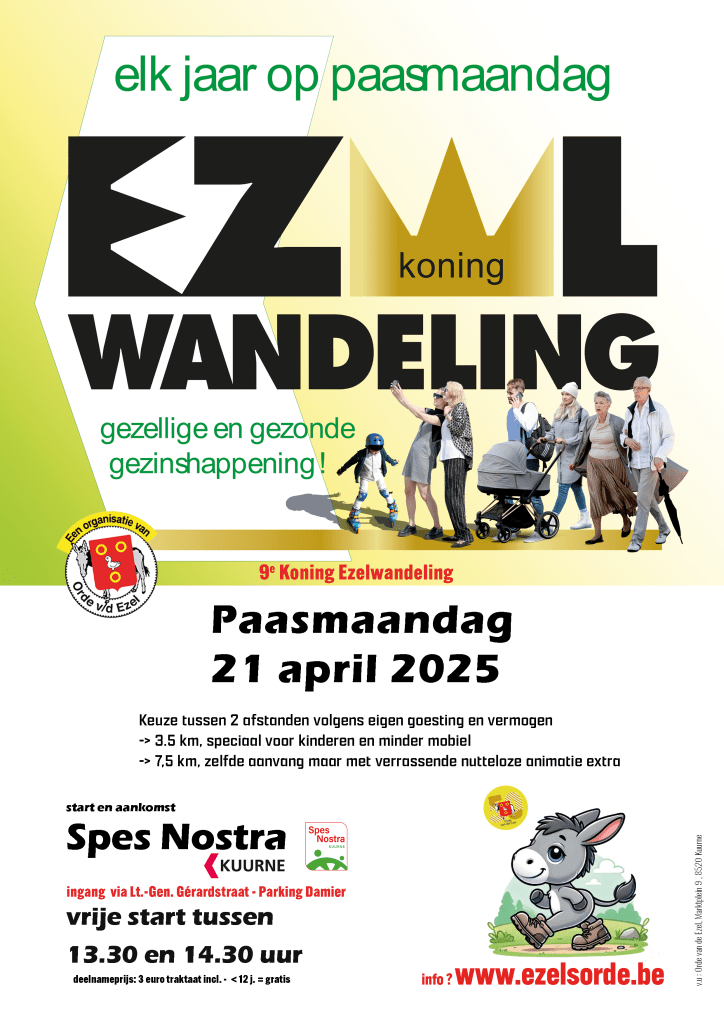 De Orde van de Ezel nodigt dan telkens u allen, Kuurnenaars, buren en vrienden, jong en minder jong, grootouders, ouders en kinderen uit om de wandelschoenen aan te trekken en deel te nemen aan de negende KONING EZELWANDELING.