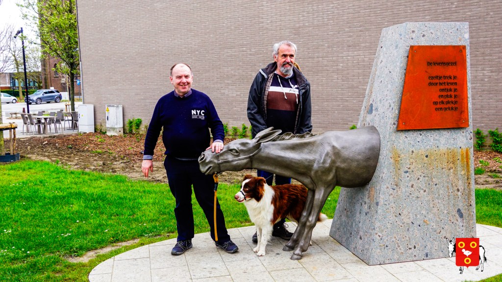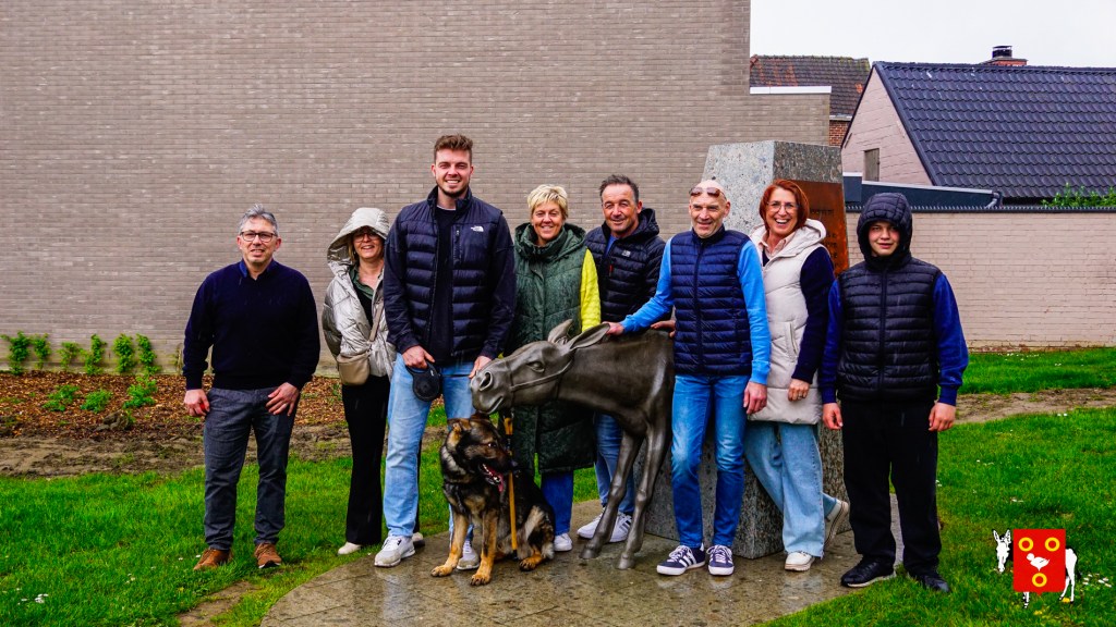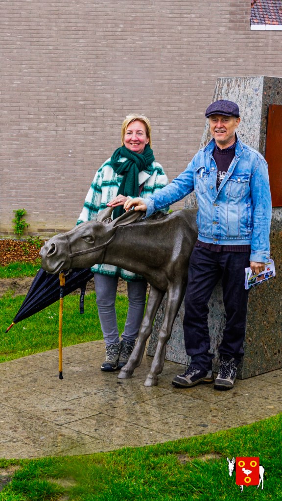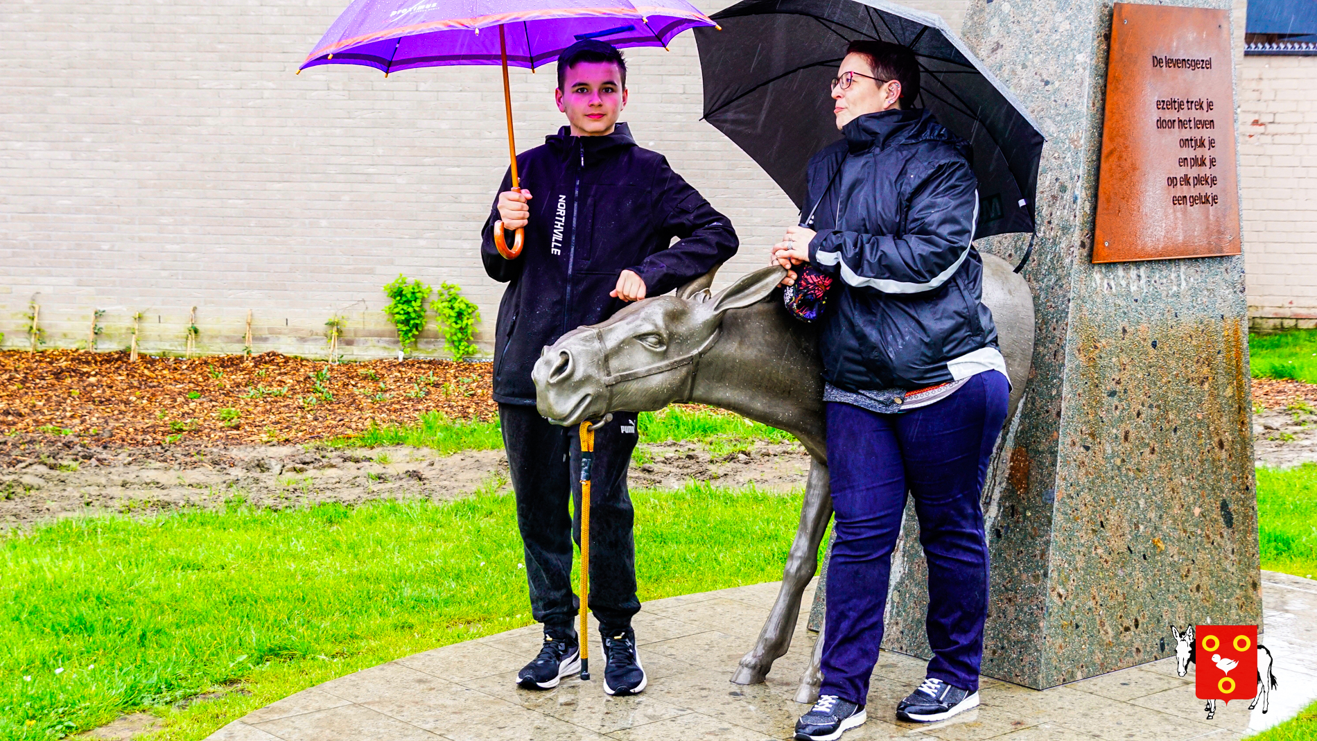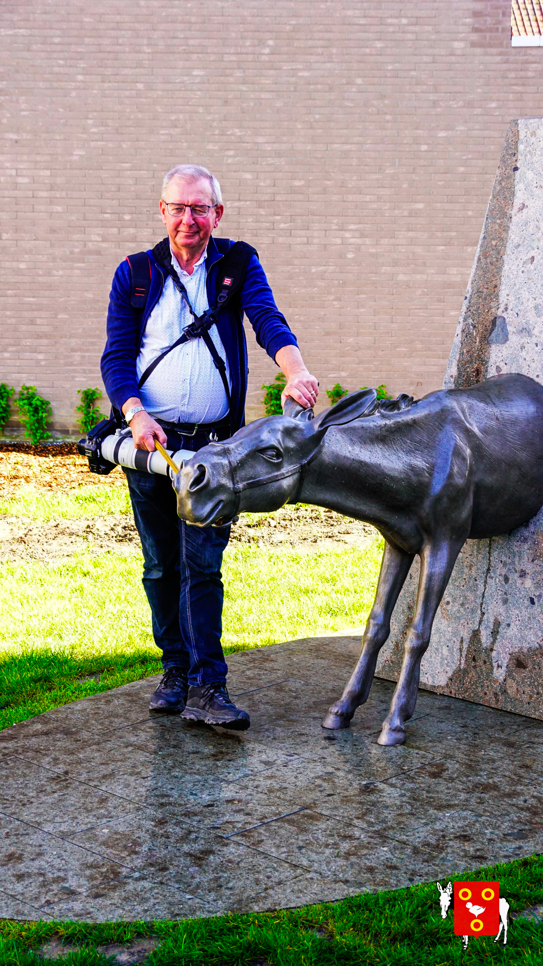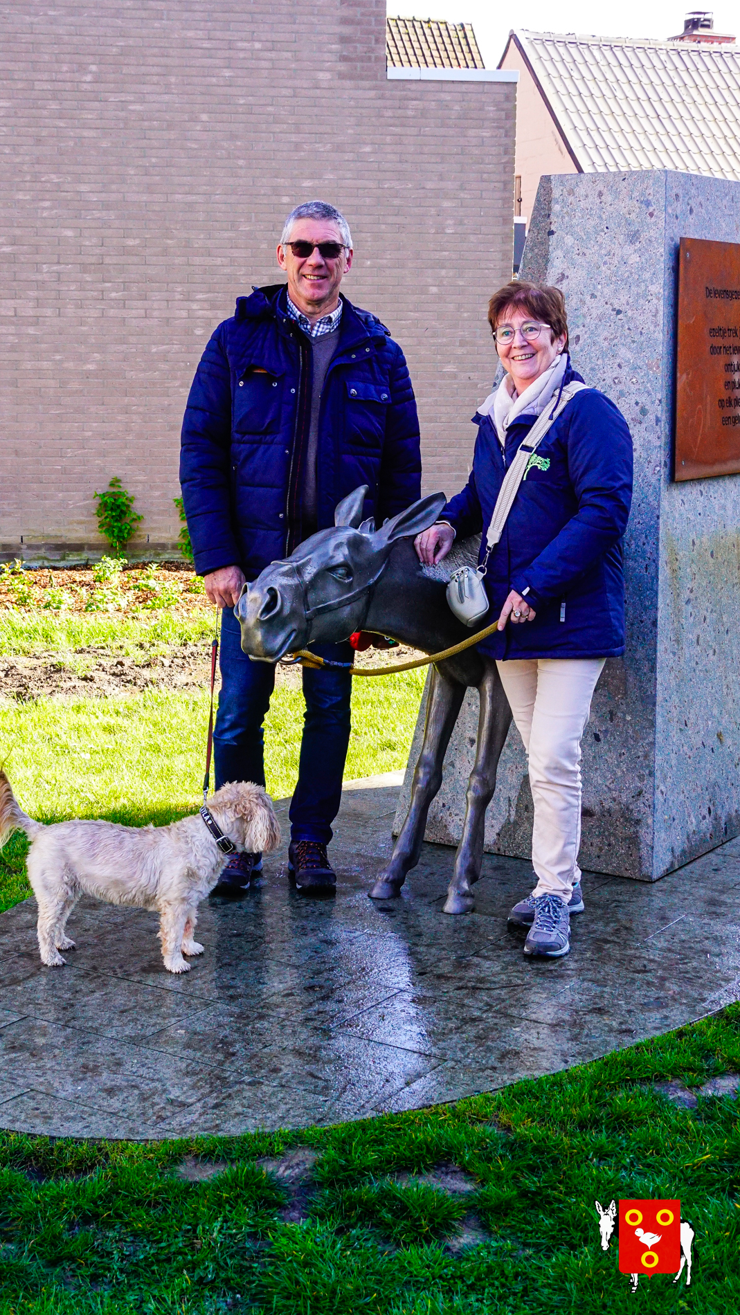 Tijdens de 8e Koning Ezelwandeling passeerden we ook het ezelsbeeld ‘De koppige Ezel’ dat ter gelegenheid van 900 Jaar Kuurne geschonken werd door het gemeentebestuur van Kuurne en de Orde van de Ezel aan de Kuurnse bevolking omdat we trots zin op onze spotnaam – De Ezels van Kuurne. Fotograaf Willy Debacker doorstond de regen en we zien hier een selectie van de wandelaars die even wouden poseren voor het beeld van Philip Moerman en het gedicht van Katrien Bonte.