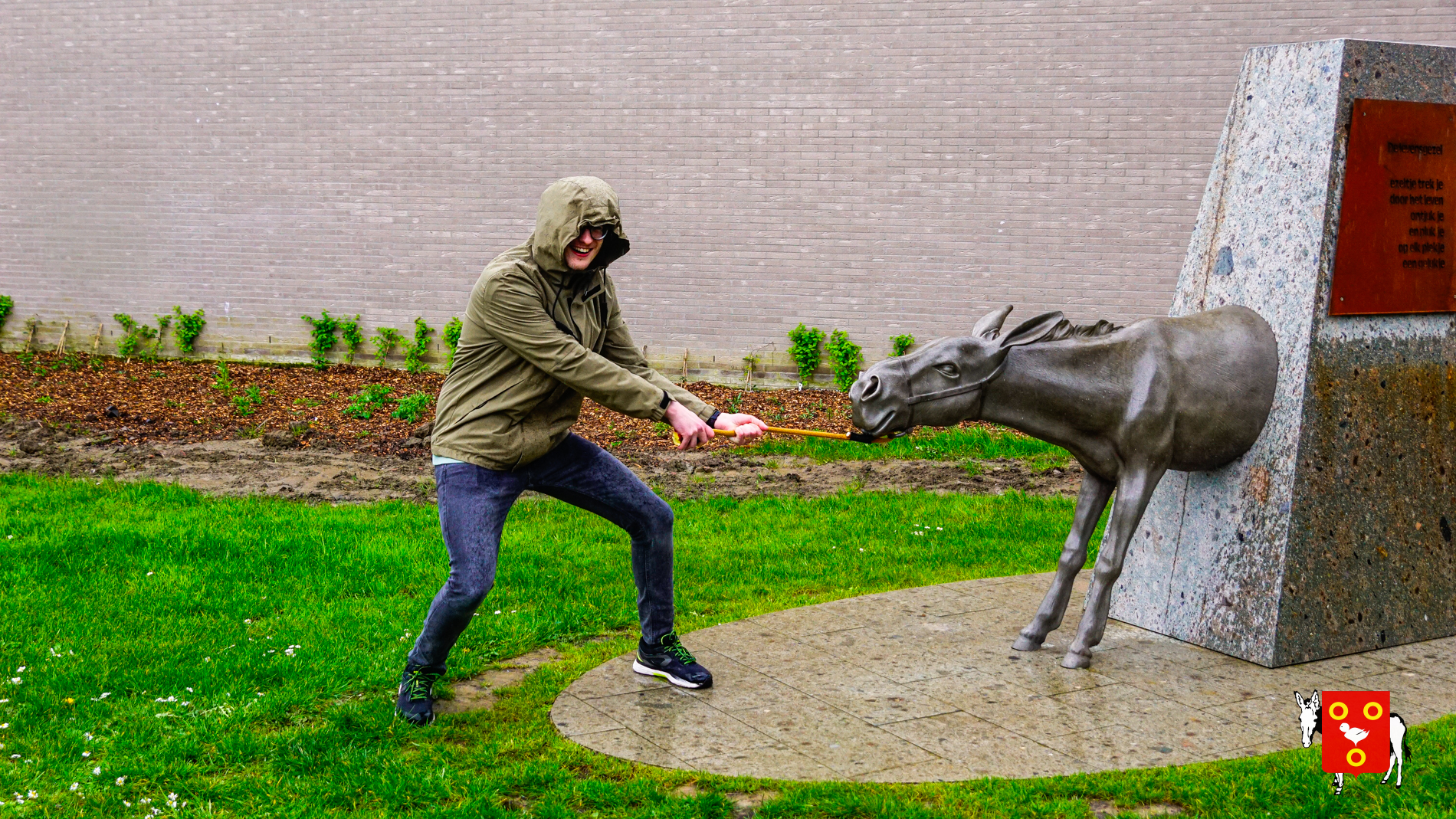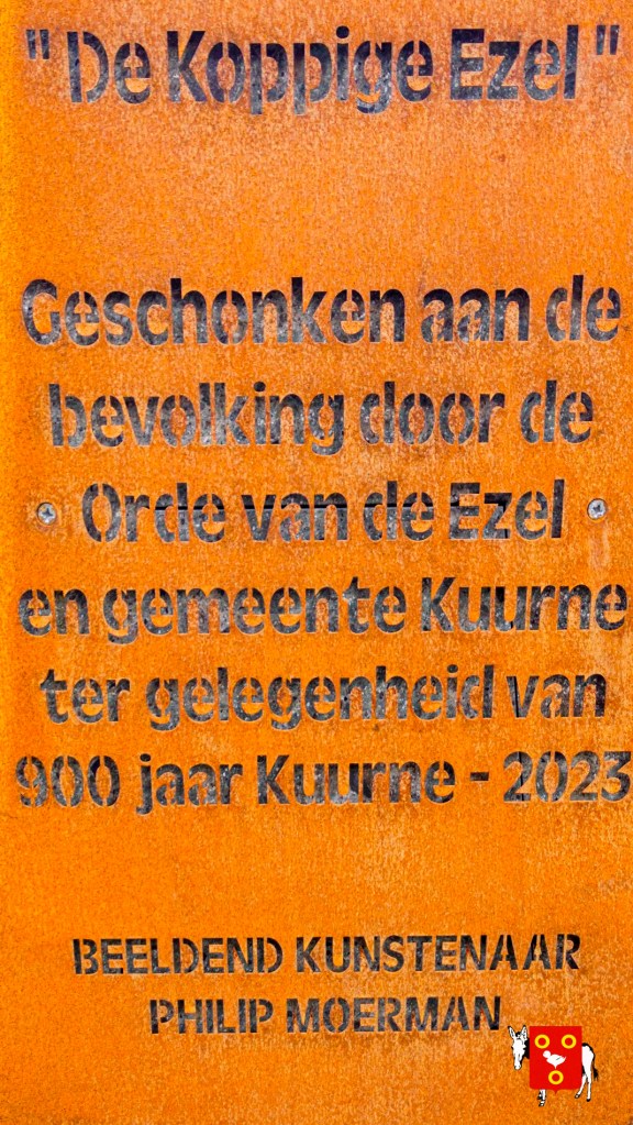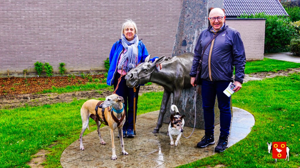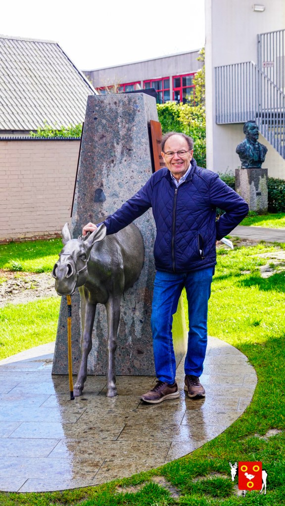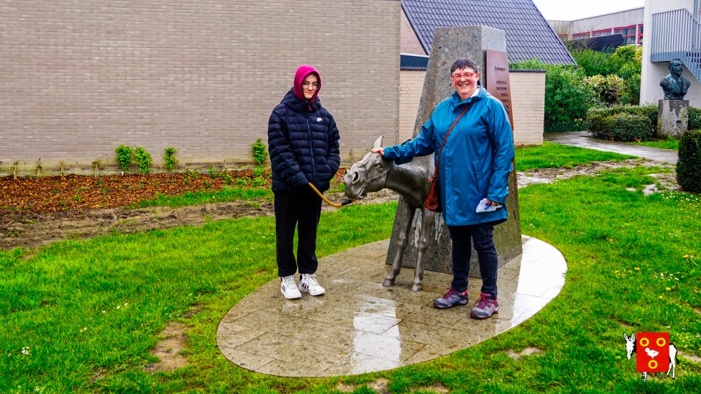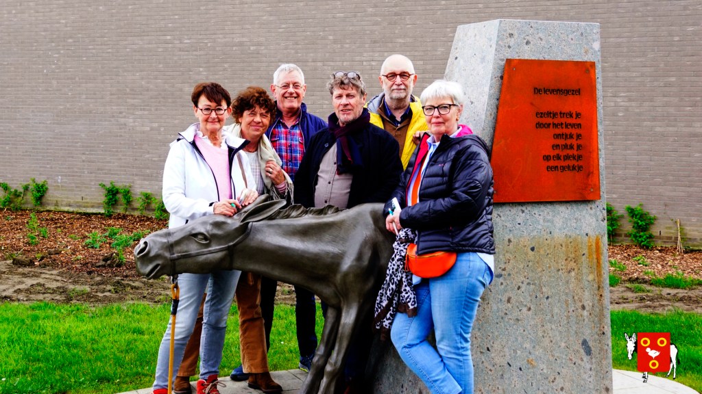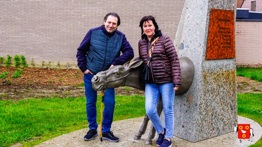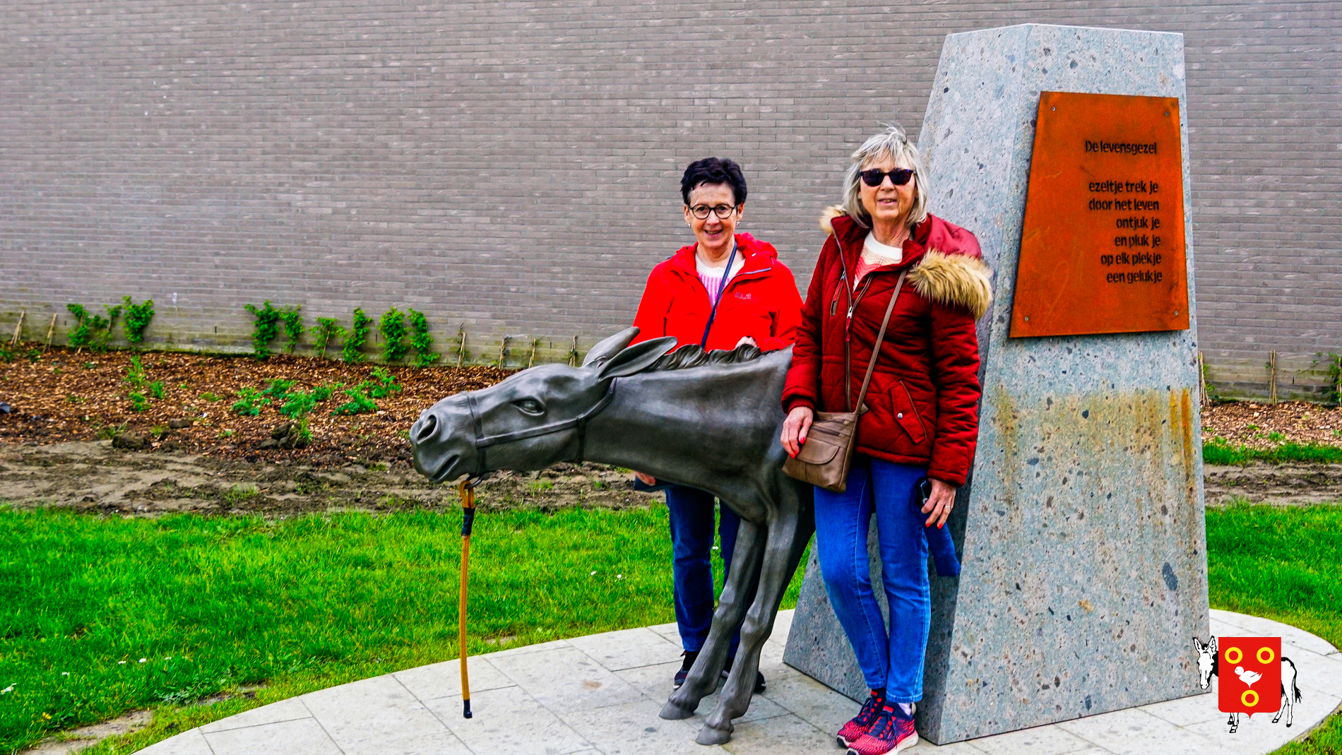 Tijdens de 8e Koning Ezelwandeling passeerden we ook het ezelsbeeld ‘De koppige Ezel’ dat ter gelegenheid van 900 Jaar Kuurne geschonken werd door het gemeentebestuur van Kuurne en de Orde van de Ezel aan de Kuurnse bevolking omdat we trots zin op onze spotnaam – De Ezels van Kuurne. Fotograaf Willy Debacker doorstond de regen en we zien hier een selectie van de wandelaars die even wouden poseren voor het beeld van Philip Moerman en het gedicht van Katrien Bonte.