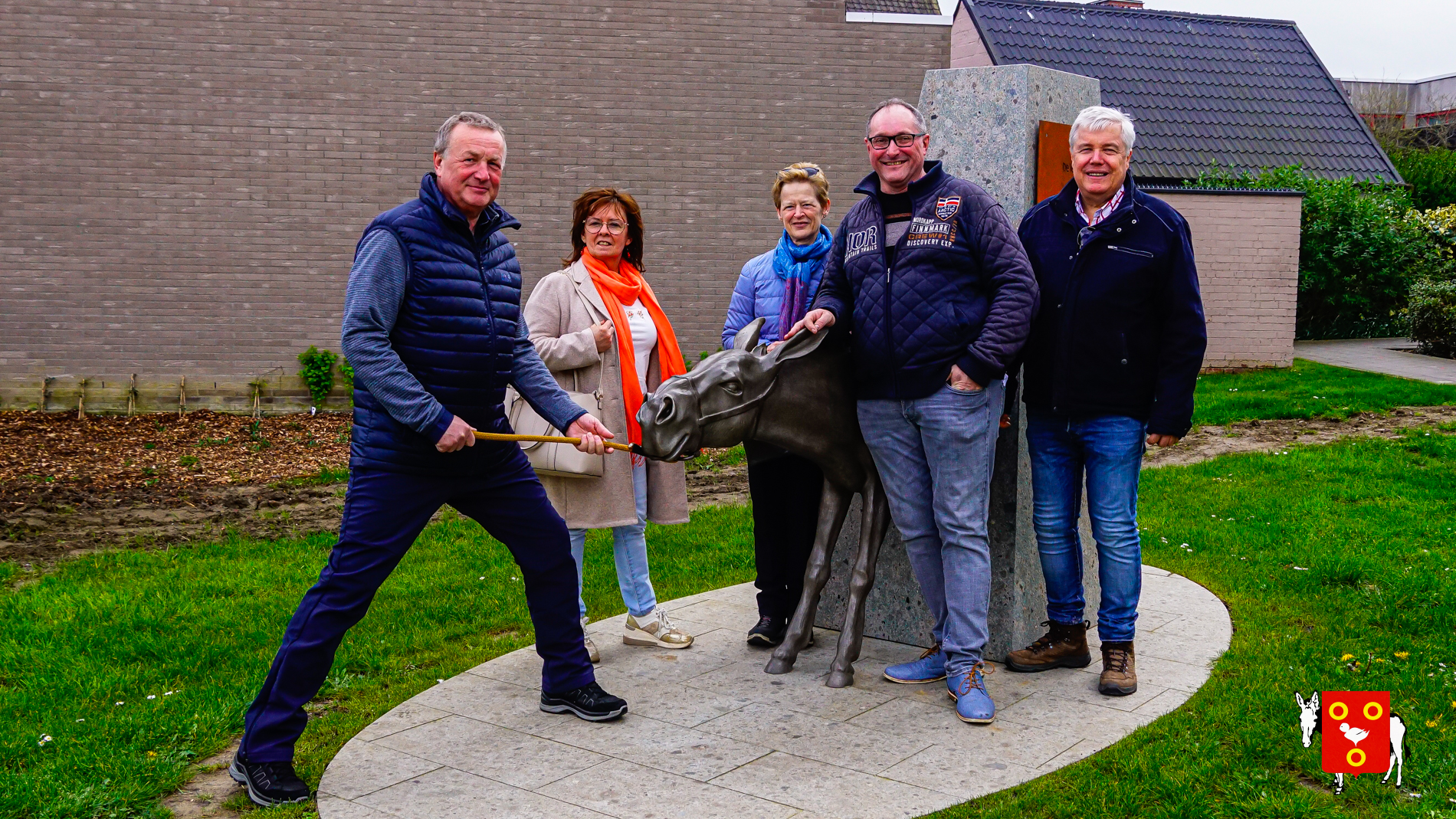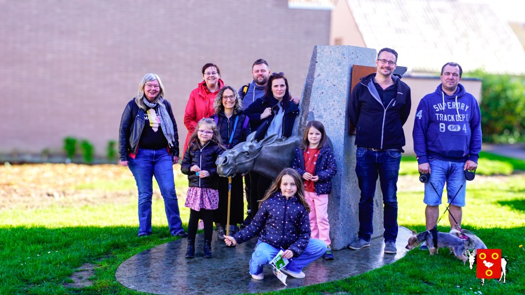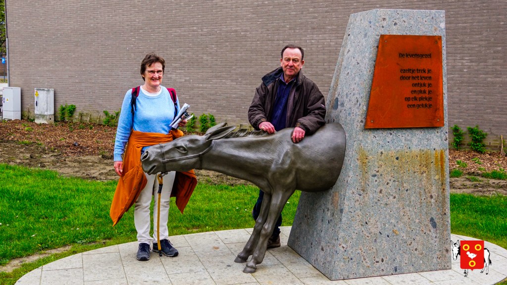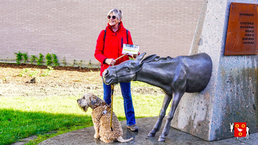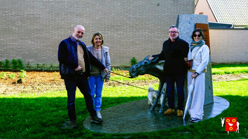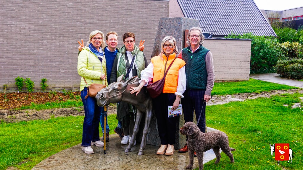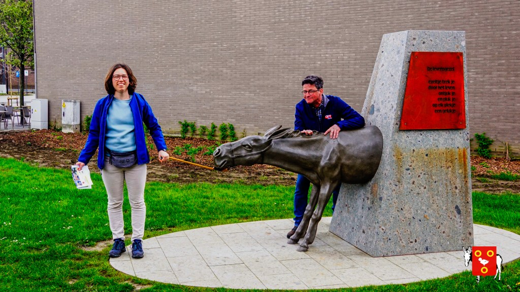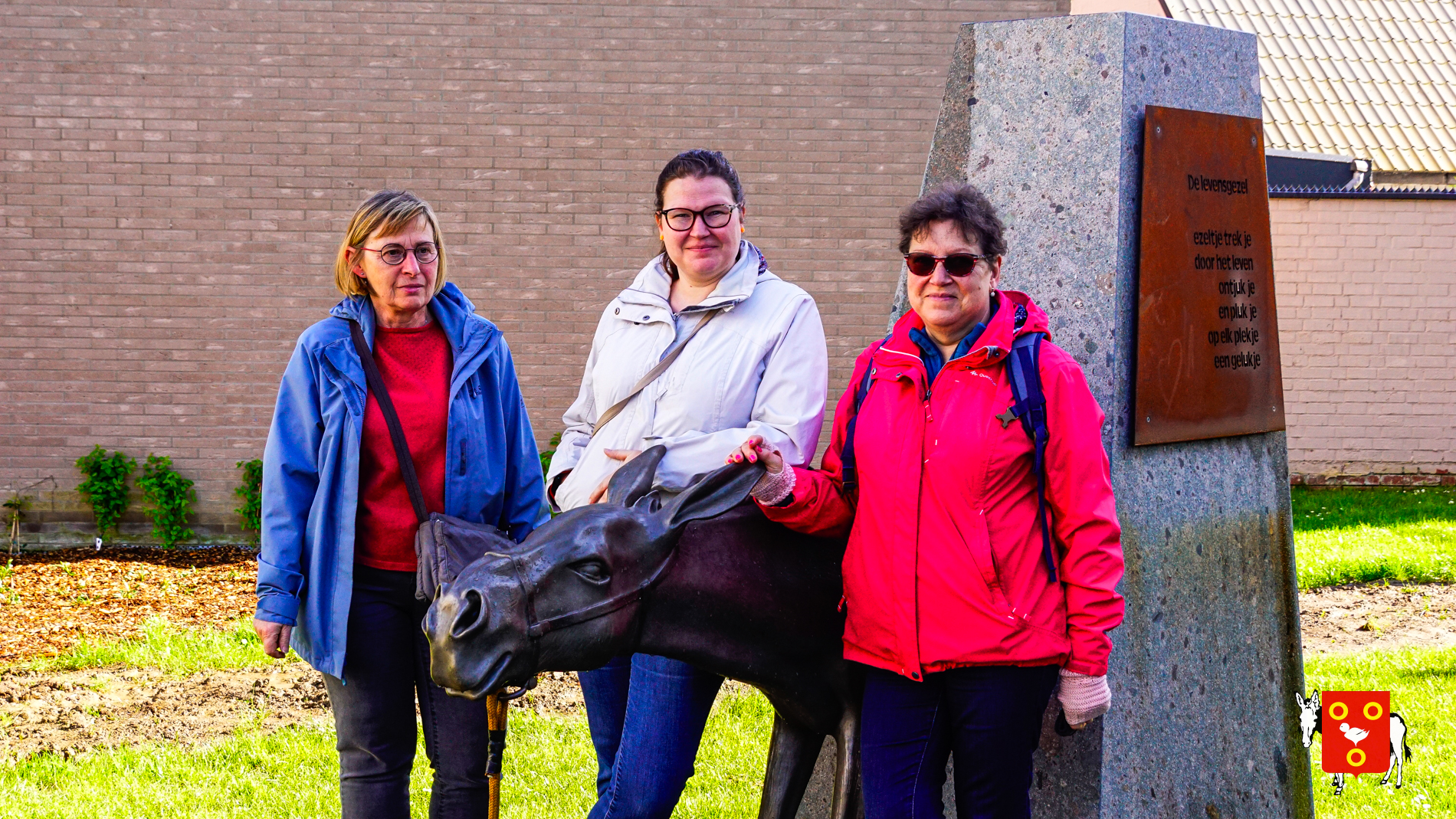 Tijdens de 8e Koning Ezelwandeling passeerden we ook het ezelsbeeld ‘De koppige Ezel’ dat ter gelegenheid van 900 Jaar Kuurne geschonken werd door het gemeentebestuur van Kuurne en de Orde van de Ezel aan de Kuurnse bevolking omdat we trots zin op onze spotnaam – De Ezels van Kuurne. Fotograaf Willy Debacker doorstond de regen en we zien hier een selectie van de wandelaars die even wouden poseren voor het beeld van Philip Moerman en het gedicht van Katrien Bonte.
