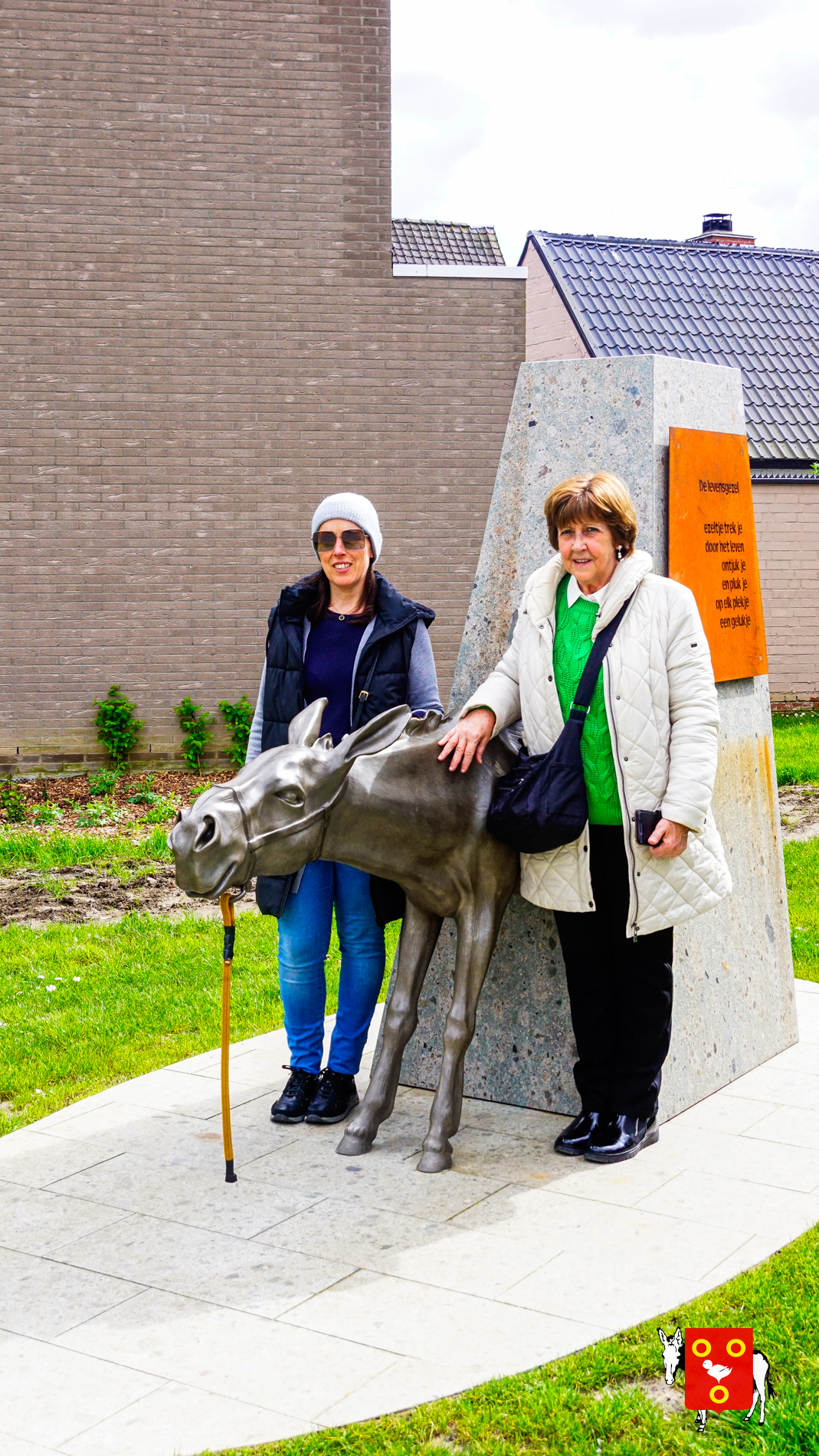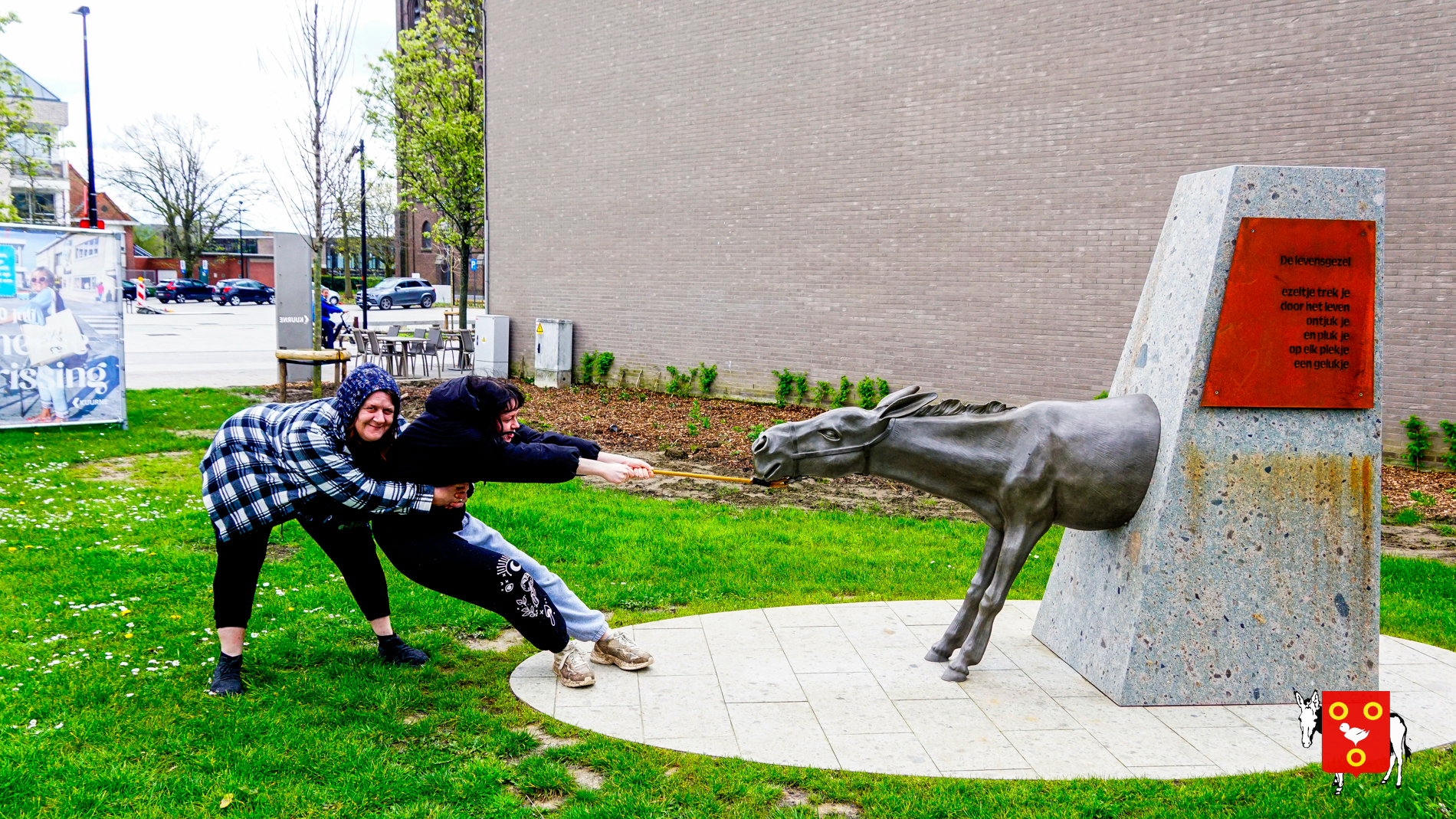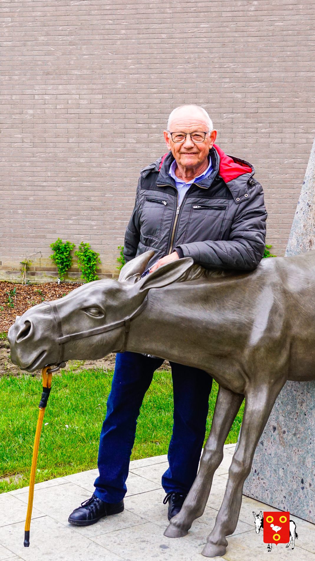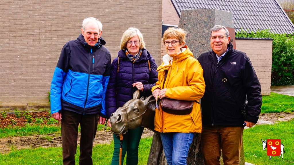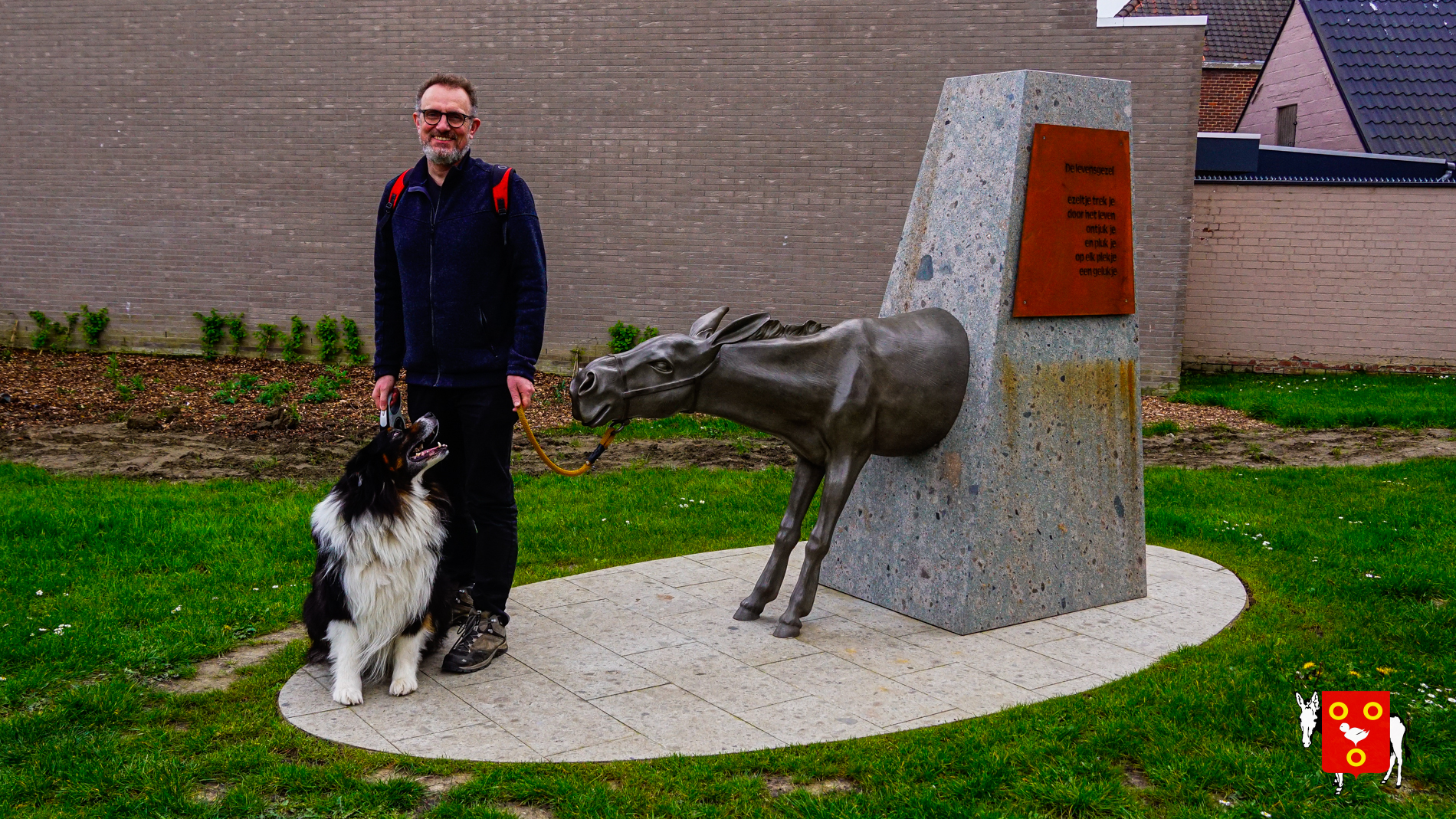 Tijdens de 8e Koning Ezelwandeling passeerden we ook het ezelsbeeld ‘De koppige Ezel’ dat ter gelegenheid van 900 Jaar Kuurne geschonken werd door het gemeentebestuur van Kuurne en de Orde van de Ezel aan de Kuurnse bevolking omdat we trots zin op onze spotnaam – De Ezels van Kuurne. Fotograaf Willy Debacker doorstond de regen en we zien hier een selectie van de wandelaars die even wouden poseren voor het beeld van Philip Moerman en het gedicht van Katrien Bonte.