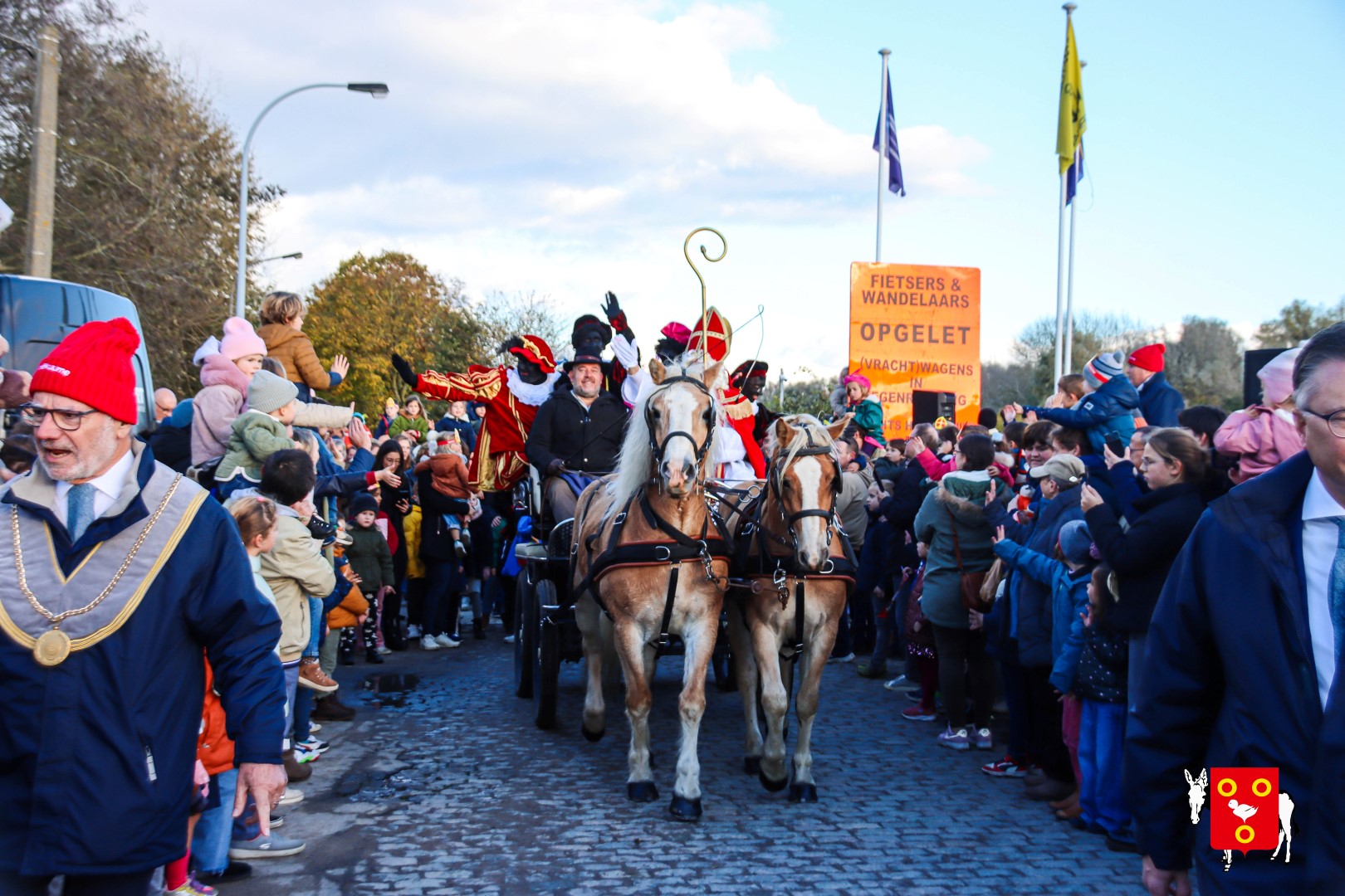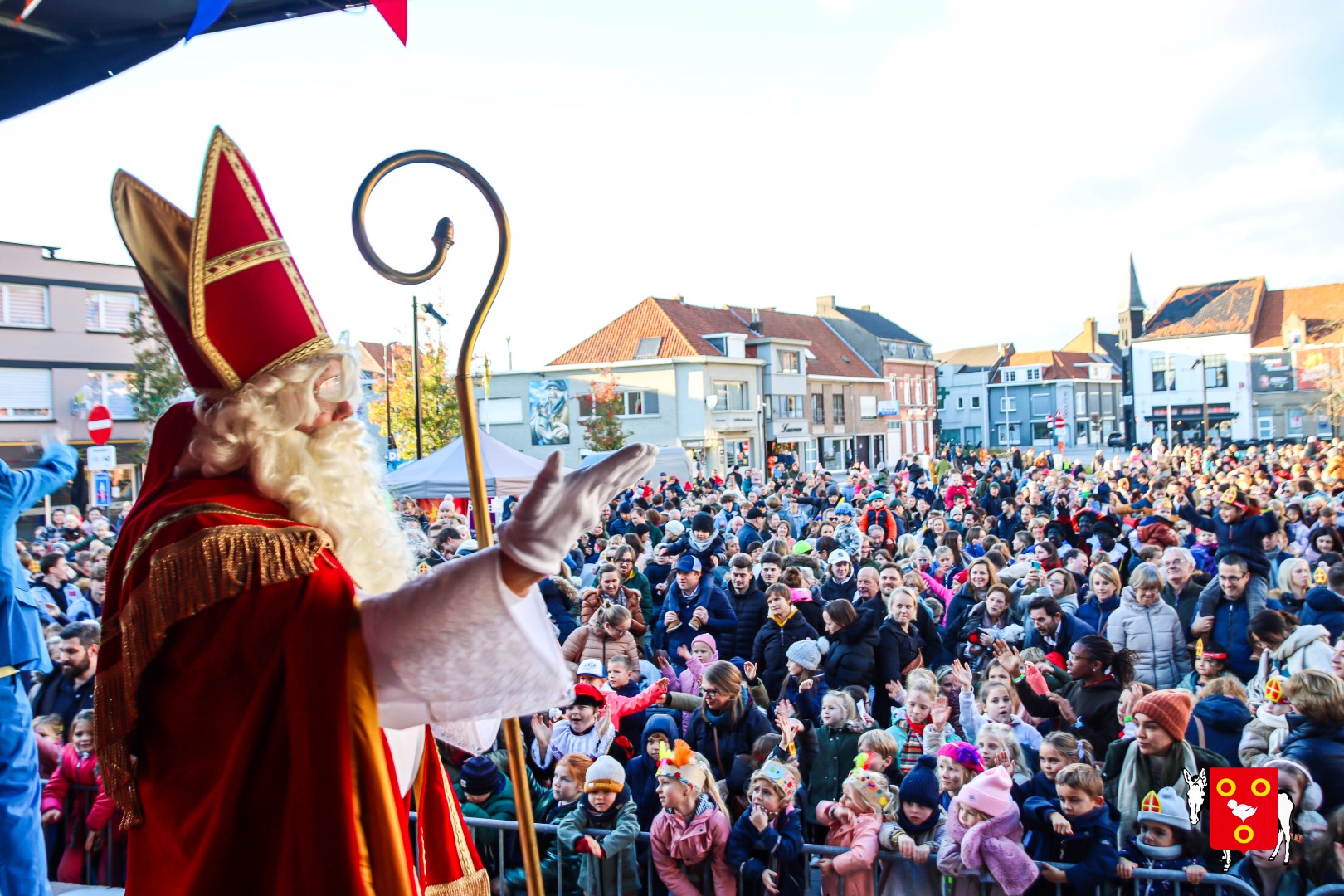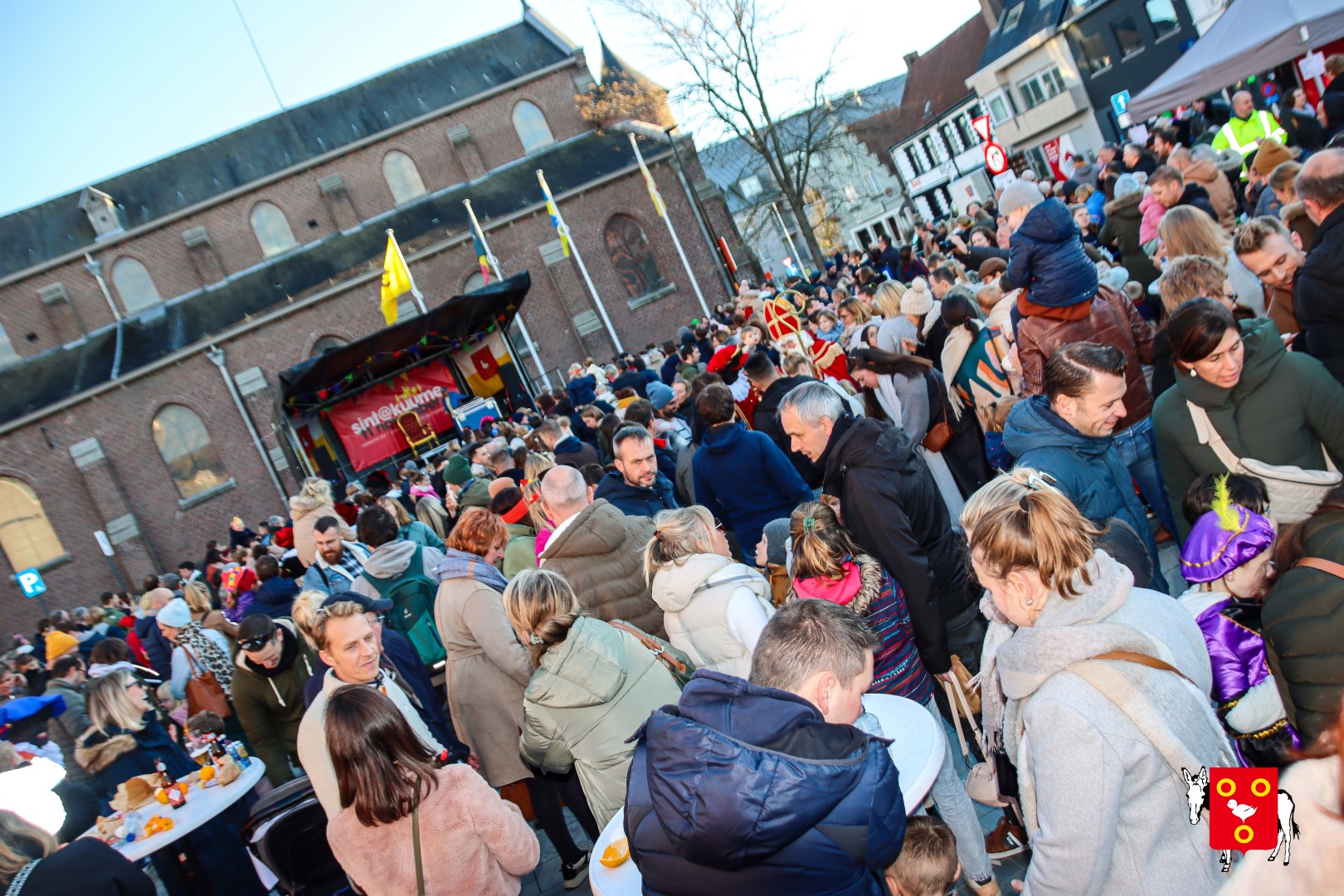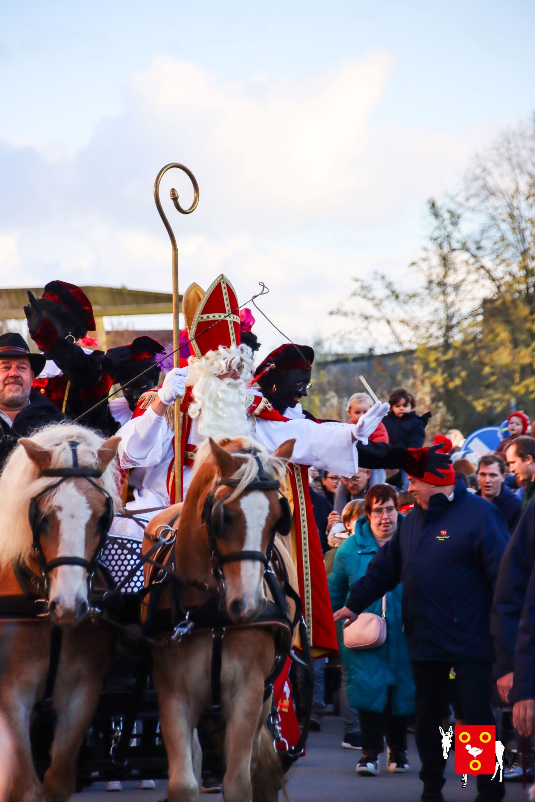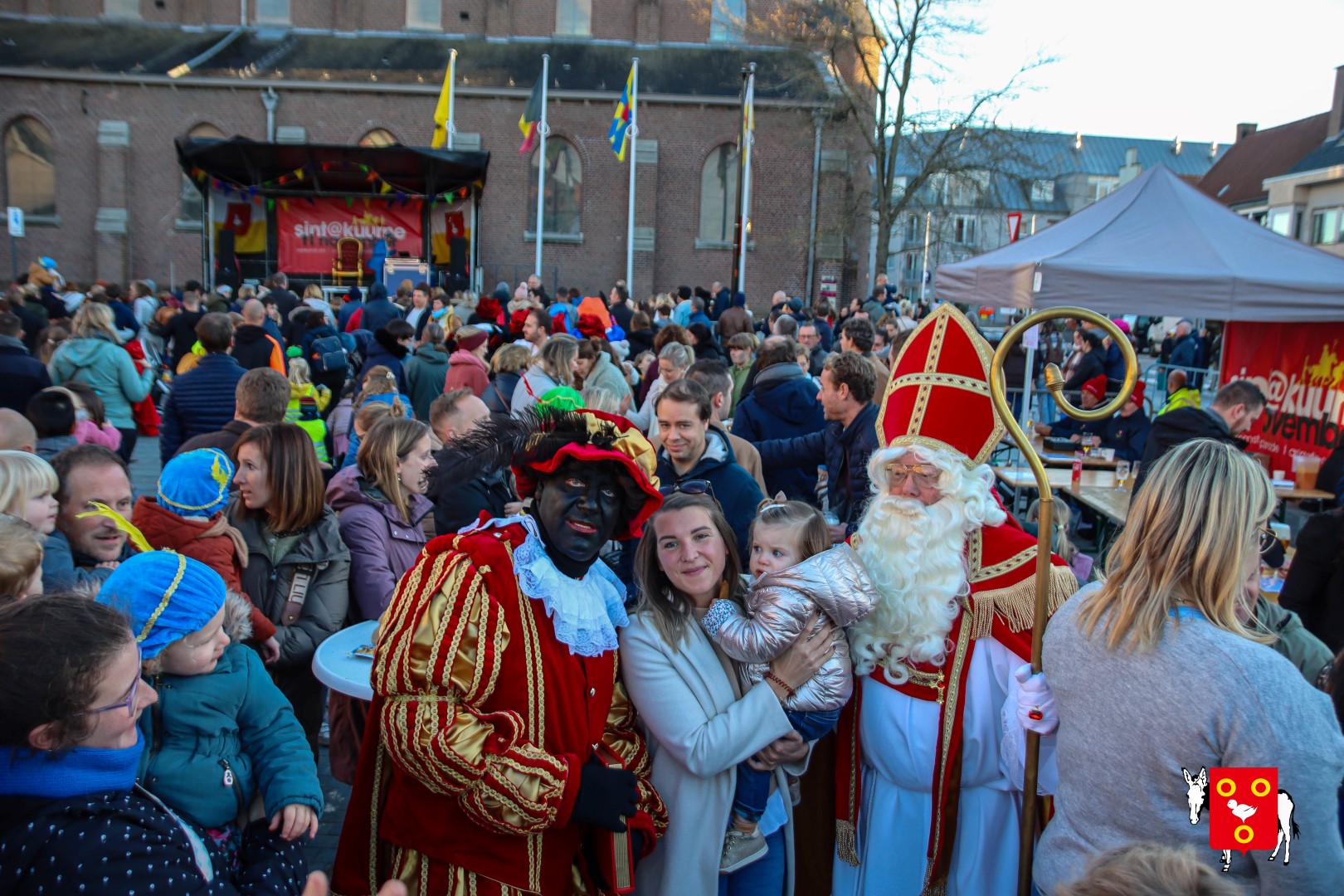 Plan B – overstappen op zijn koets met zijn paarden #redelijkweervandaag en #hetmageensstoppenmetregenen. Zo konden de honderden Kuurnse (en ze kwamen zelfs uit Kortrijk en Harelbeke) met hun ouders, grootouders de Sint en zijn zwarte pieten toch konden ontvangen. Op het marktplein brak het feest los met de ontvangst en Raf Violi die zowel klein als groot, jong en oud deed dansen van plezier.