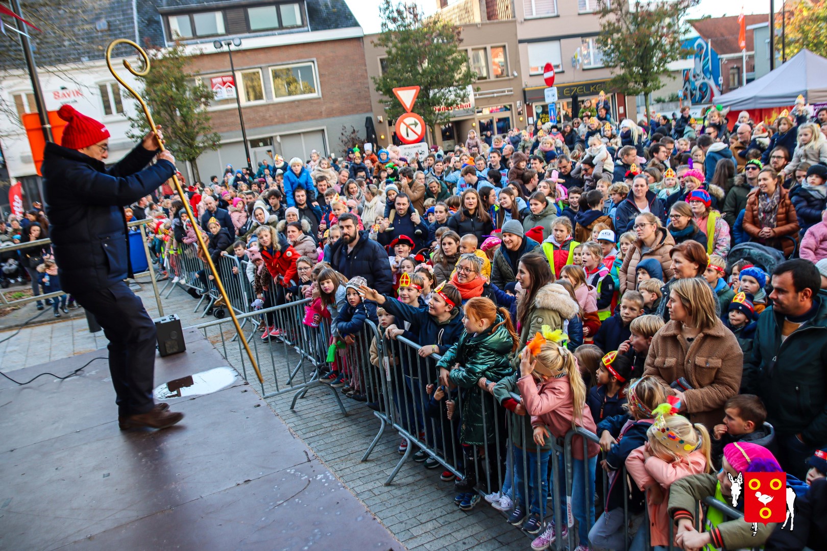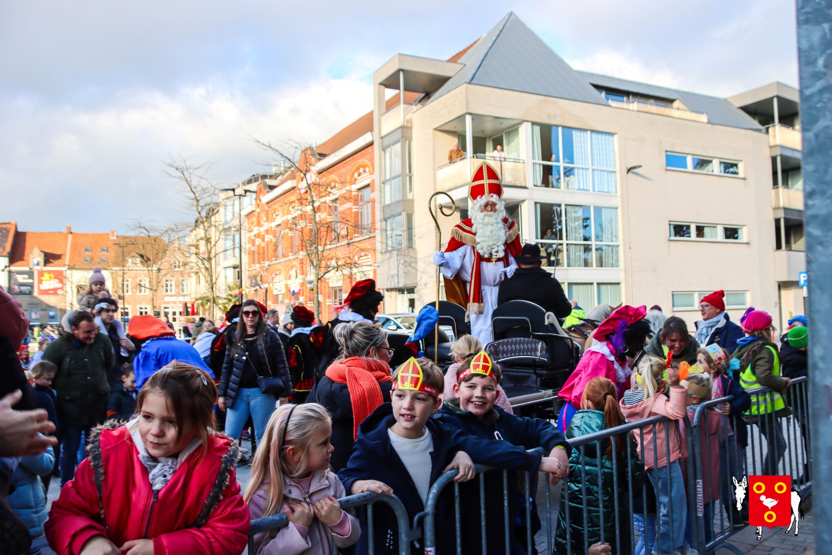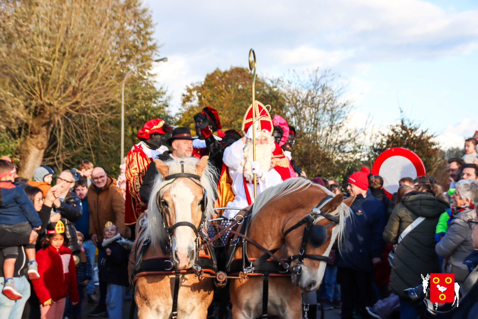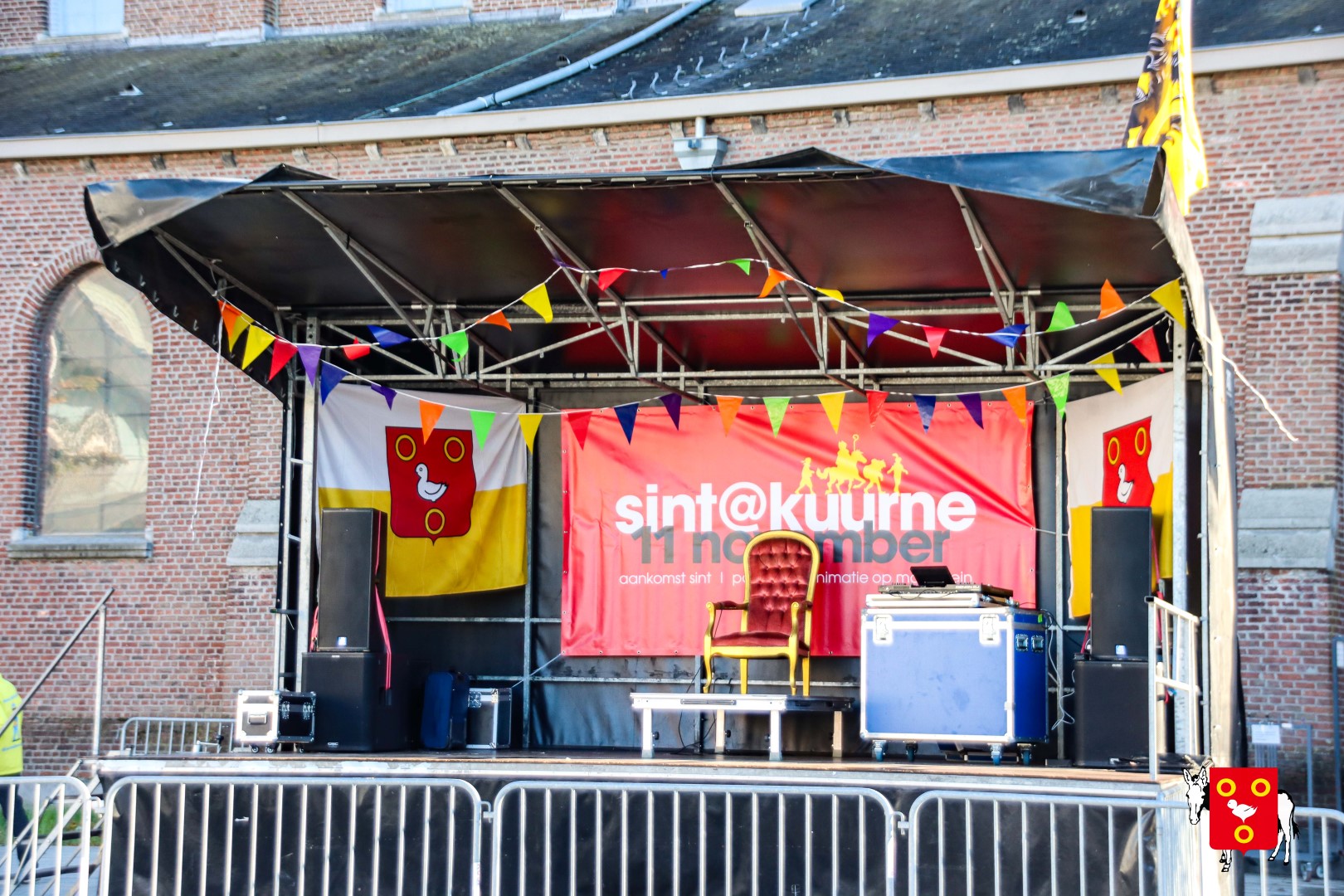 Plan B – overstappen op zijn koets met zijn paarden #redelijkweervandaag en #hetmageensstoppenmetregenen. Zo konden de honderden Kuurnse (en ze kwamen zelfs uit Kortrijk en Harelbeke) met hun ouders, grootouders de Sint en zijn zwarte pieten toch konden ontvangen. Op het marktplein brak het feest los met de ontvangst en Raf Violi die zowel klein als groot, jong en oud deed dansen van plezier.